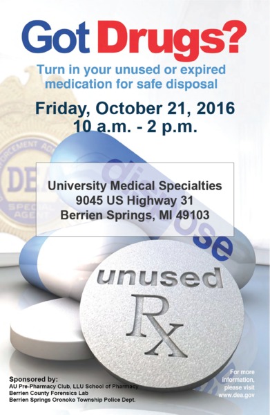 Andrews University Pre-Pharmacy Club in partnership with the Berrien Springs Oronoko Township Police Department, will be hosting a drug pick-up event at the University Medical Specialties on Friday from 10 AM - 2 PM. Turn in your unused or expired medication for safe disposal. Please note: No liquid medications will be accepted.