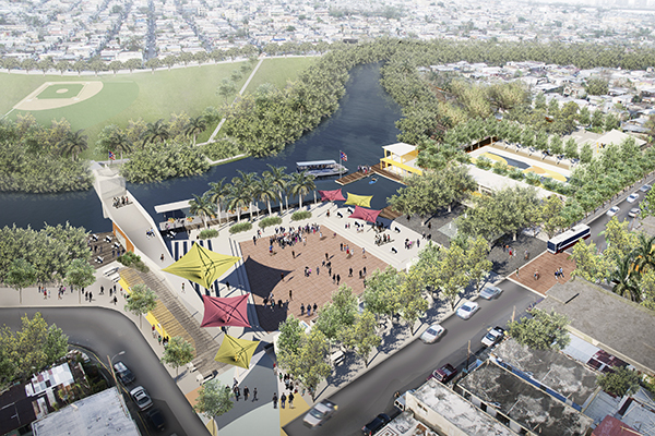 View of a proposed water plaza at El Caño Martín Peña in San Juan, Puerto Rico. The plaza design helps to mitigate storm water and promotes social, economic and recreational activities to help uplift this disadvantaged but vibrant community.
