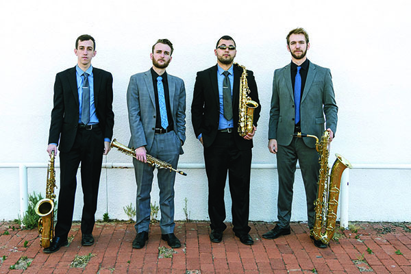 The Aruna Quartet features William Pyle on soprano saxophone, Tony Guzman on alto saxophone, Ryan Hill on tenor saxophone and Andrew Schoen on baritone saxophone. Their Double Gold Tour program includes pieces by Alexander Glazunov, William Albright and David Ludwig.