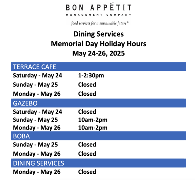 Please note the Dining Services hours for the Memorial Day holiday.