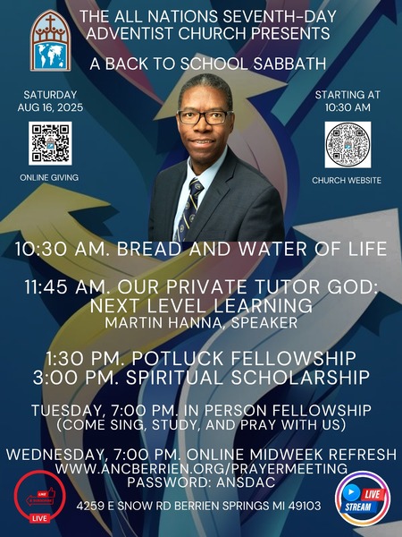 Join us for our back-to-school worship experience this Sabbath, August 16, at 11:45 am, as Martin Hanna presents "Our Private Tutor God: Next Level Learning." Adult and Children's Sabbath School begins at 10:30 am. We will have lunch after the service followed by an afternoon program on "Spiritual Scholarship." We look forward to seeing you there!