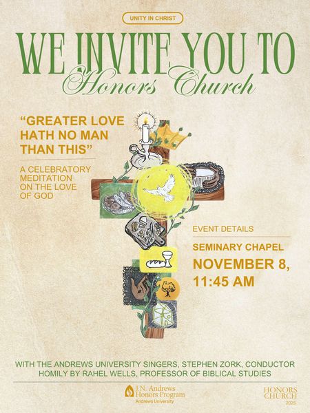 You are invited to worship at the fifteenth annual Honors Church, themed "Greater Love Hath No Man Than This." The service will be a celebratory meditation on the love of God and will take place on Sabbath, Nov. 8, at 11:45 a.m. in the Seminary chapel. It will feature Stephen Zork, director of choral studies, and the Andrews University Singers as well as a homily by Rahel Wells, professor of biblical studies.