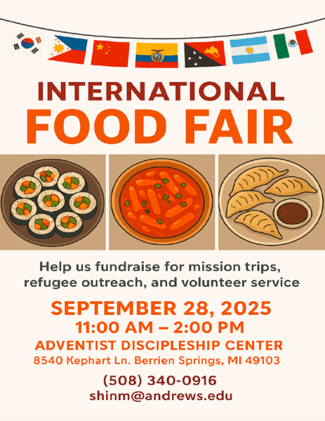 The Adventist Discipleship Center will be hosting its International Food Fair on Sunday, Sept. 28, from 11 a.m.–2 p.m. in the parking lot of the center, located at 8540 Kephart Lane, Berrien Springs, MI 49103.