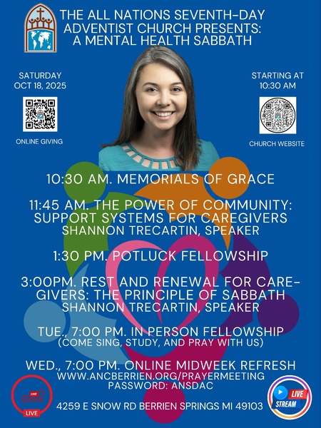 Join us for a Mental Health worship experience at the All Nations SDA Church this Sabbath, October 18, at 11:45 am, as Shannon Trecartin presents "The Power of Community: Support Systems for Caregivers." Adult and Children's Sabbath School begins at 10:30 am. We will have lunch followed by an afternoon program on "Rest and Renewal for Caregivers: The Principle of Sabbath" at 3 pm. We look forward to seeing you there!