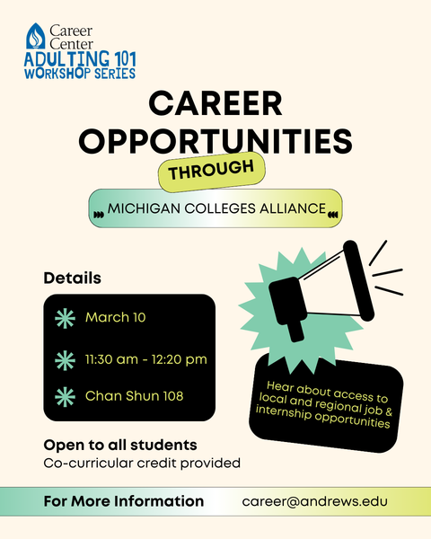 Did you know that Andrews University students have VIP access to local and regional job and internship opportunities. This is made possible through a partnership with the Michigan Colleges Alliance (MCA) organization. Attend this session to learn more about MCA and how you can access these opportunities. This session will be presented on Tuesday, March 10, 2026 from 11:30 am – 12:20 pm in Chan Shun Hall, Room 108. It is open to all majors including graduate students. Co-curricular credit will be provided. A hybrid option is available for distance learning students only by contacting career@andrews.edu.