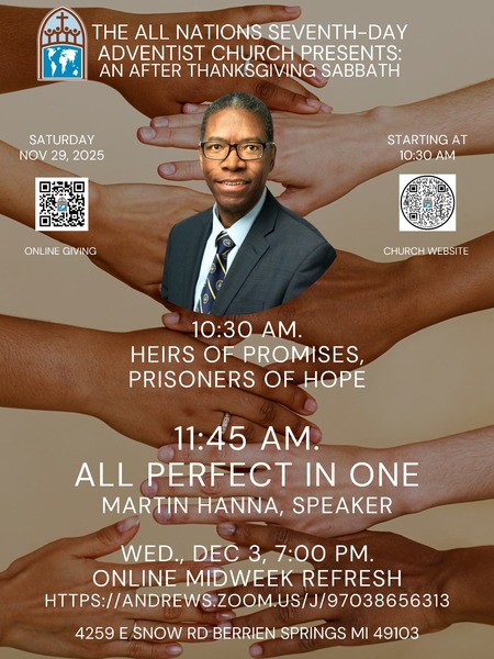 Join us for our worship experience at the All Nations SDA Church this Saturday, November 29, at 11:45 am as Martin Hanna presents "All Perfect in One." Adult and Children's Sabbath School begins at 10:30 am. We look... read more