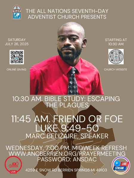 Join us for our worship experience this Sabbath, July 26, at 11:45 am, as Marc Belizaire presents "Friend or Foe." Adult and Children's Sabbath School begins at 10:30 am. We look forward to seeing you there! ...