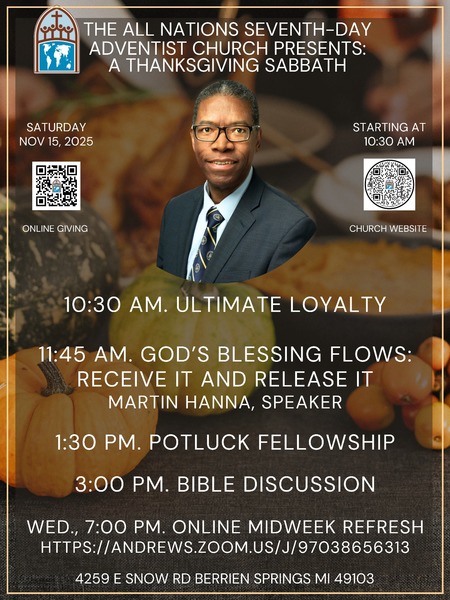 Join us for our Thanksgiving worship experience at the All Nations SDA Church this Saturday, November 15, at 11:45 am, as Martin Hanna presents "God's Blessing Flows: Receive It & Release It." Adult and Children's Sabbath School begins... read more