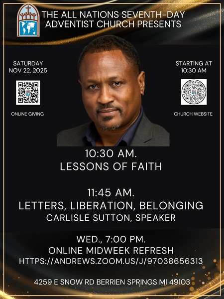 Join us for our worship experience at the All Nations SDA Church this Saturday, November 22, at 11:45 am, as Carlisle Sutton presents "Letters, Liberation, Belonging." Adult and Children's Sabbath School begins at 10:30 am.... read more