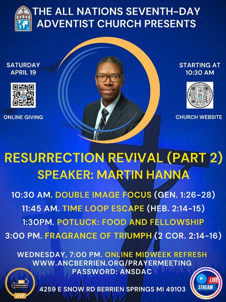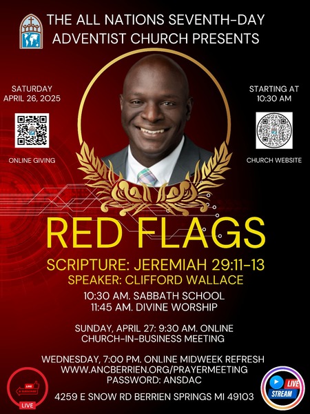 Join us for our worship experience this Saturday, April 26 @ 11:45 am as Clifford Wallace presents "Red Flags." Adult and Children's Sabbath School begins @ 10:30 am. Breakfast is served @ 10 am. We look forward to...