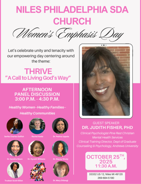 Join us for a power-packed Women's Emphasis Day at the Niles Philadelphia Seventh-day Adventist Church. Our theme is "Thrive: A Call to Living God's Way." The day begins at 11:30 a.m. with special guest speaker Judith Fisher, PhD,... read more